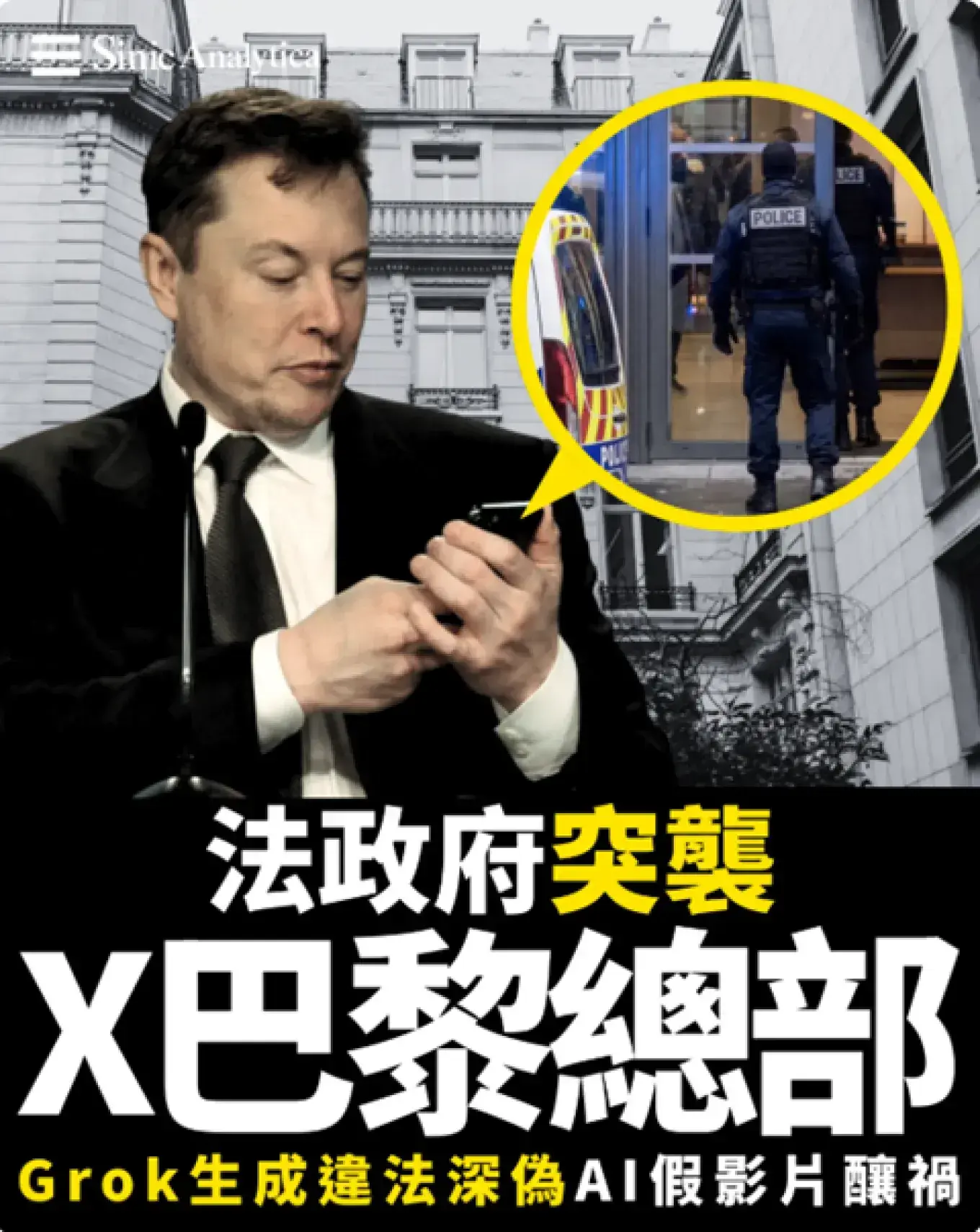 By KF Cheng on Thu, 2026-02-05 - 00:26 Short Title 歐美網路內容監管戰升級 法國突擊搜查X Private Public Image 2026-02-05 法國政府突擊搜查社交平台X巴黎辦公室,網絡犯罪檢察官宣布此次行動涉及多項調查,調查範圍包括算法干涉政治及AI生成違法內容,檢方同時召見平台高管配合調查,此事標記在X廣傳法國政變AI假影片後,歐洲與美國將在內容管理上展開正面對撞。 More |法國當局啟動搜查行動 法國網絡犯罪檢察官於周二宣布此次搜查行動,搜查目標為X平台巴黎辦公室,網絡犯罪警察與歐洲警察署(Europol)聯合執行任務,調查最初開於去年早間,焦點在於平台算法涉嫌「外國干涉」法國政治,隨後調查範圍擴大至Grok生成的違法深度偽作圖像,Grok為X平台旗下的AI聊天機器人,檢察官指出,此次搜查為歐洲當局對X平台的重大執法行動。 |多項潛在違法指控浮現 除上述指控外,法國當局正就X的其他違法行為進行調查,相關指控涵蓋平台傳播兒童色情內容,否認大屠殺亦列為調查範圍,該行為在法國屬於違法,當局召見X前行政總裁雅卡里諾(Linda Yaccarino)及其他高管,當局亦召見平台創始人馬斯克(Elon Musk)於四月接受訪問,要求當事人前往接受所稱的「自愿訪問」,檢察官將調查形容為處於「建設性」階段,目標在於確保X遵守法國法律。 |歐美監管裂痕加深 此次搜查與召見行動,標記歐美衝突日益加劇,歐美兩方在內容監管上的緊張局勢長期積累,歐洲監管機構正加大力度,強制執行內容管理規範,規範適用範圍涵蓋TikTok、Instagram及X等平台,與此同時,特朗普(Donald Trump)政府指控歐洲當局企圖壓制異見,美國官員指出,歐洲此舉影響範圍延伸至全球,此議題正成為歐美數字治理政策上的核心分歧,截至目前,X公司迄未就上述事宜回應。 市場及商業 Sinic Analytics 法國