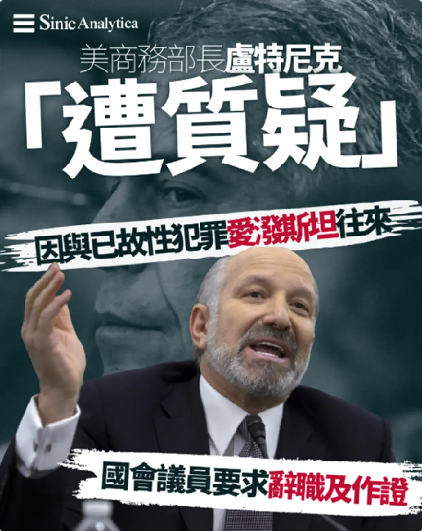 美國商務部長盧特尼克(Howard Lutnick)遭國會議員要求辭職,