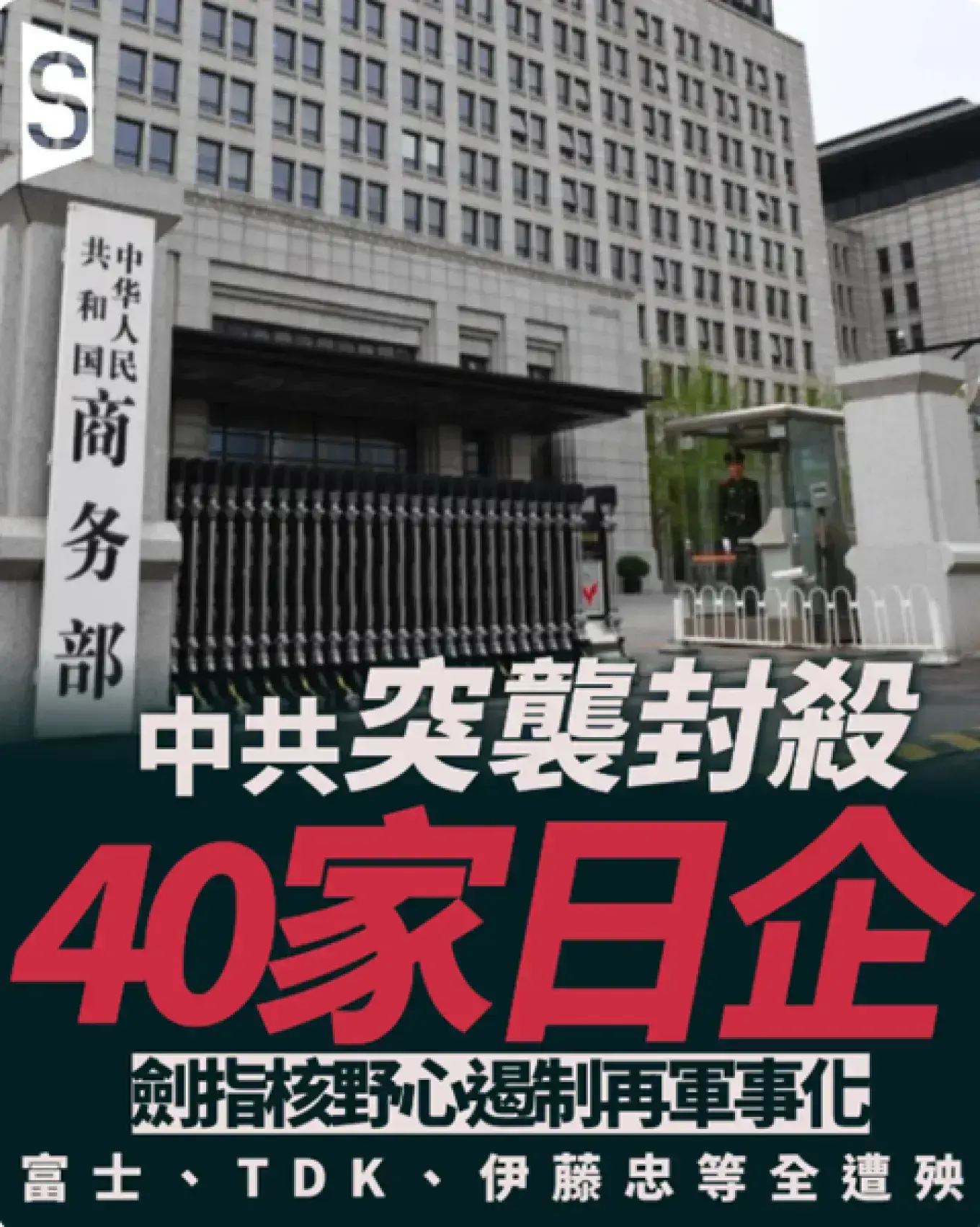 中共商務部於星期二宣布,即時出口管制40家日本企業及機構。