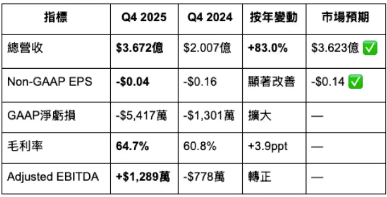 收入與EPS雙超預期: Q4營收 $3.672億,超預期 $3.623億;Non-GAAP EPS -$0.04,大幅優於預期 -$0.14,惟此數字幾乎完全由剔除SBC所驅動。