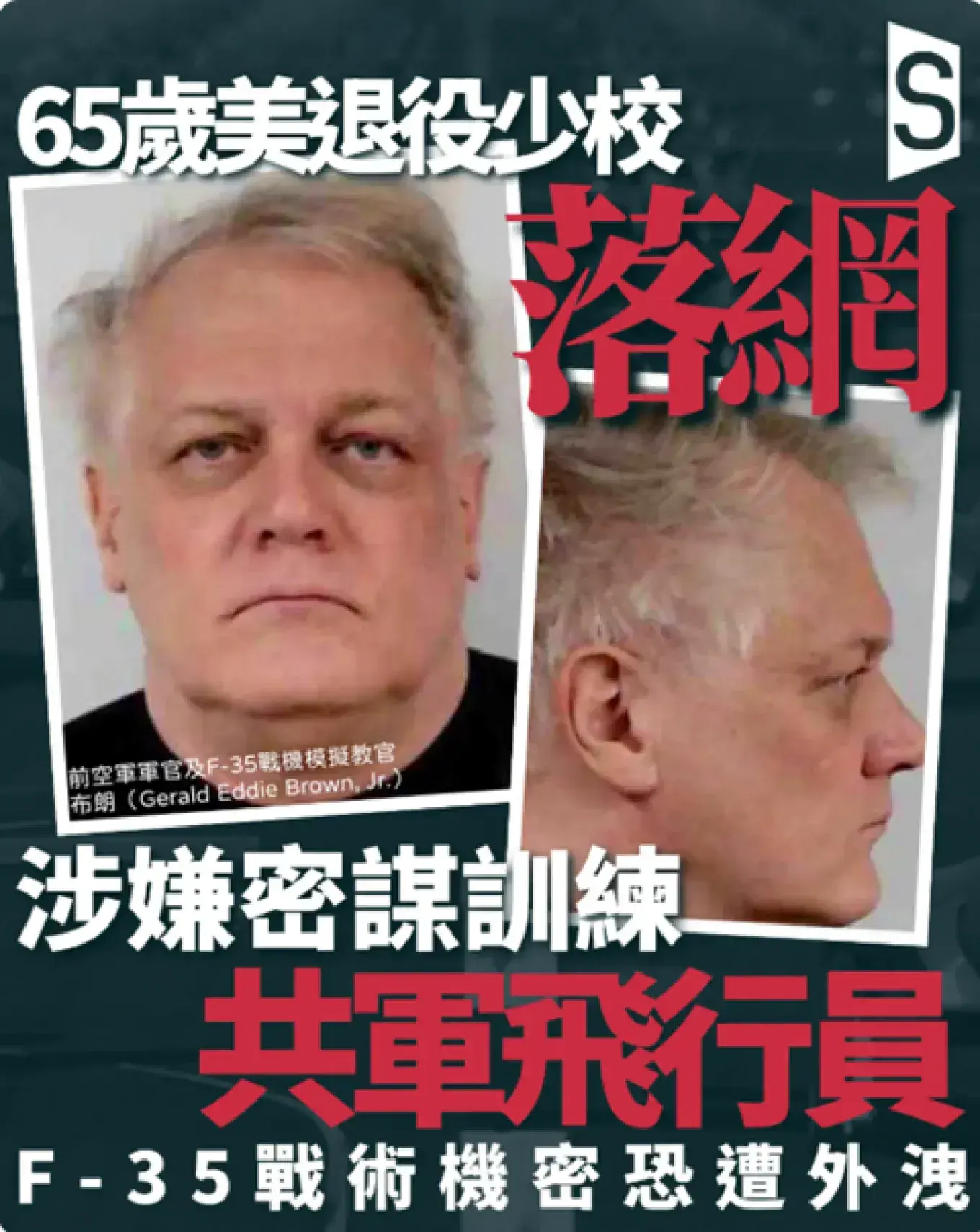 司法部周三發表聲明,逮捕前空軍軍官及F-35戰機模擬教官布朗(Gerald Eddie Brown, Jr.)。布朗現年65歲,在印第安納州落網。當局指控他密謀訓練中共軍事飛行員。他預計周四出庭受審。此案於特朗普(Donald Trump)計劃訪問北京前數週曝光。美中兩國正在進行激烈的情報戰,FBI介入調查此案。