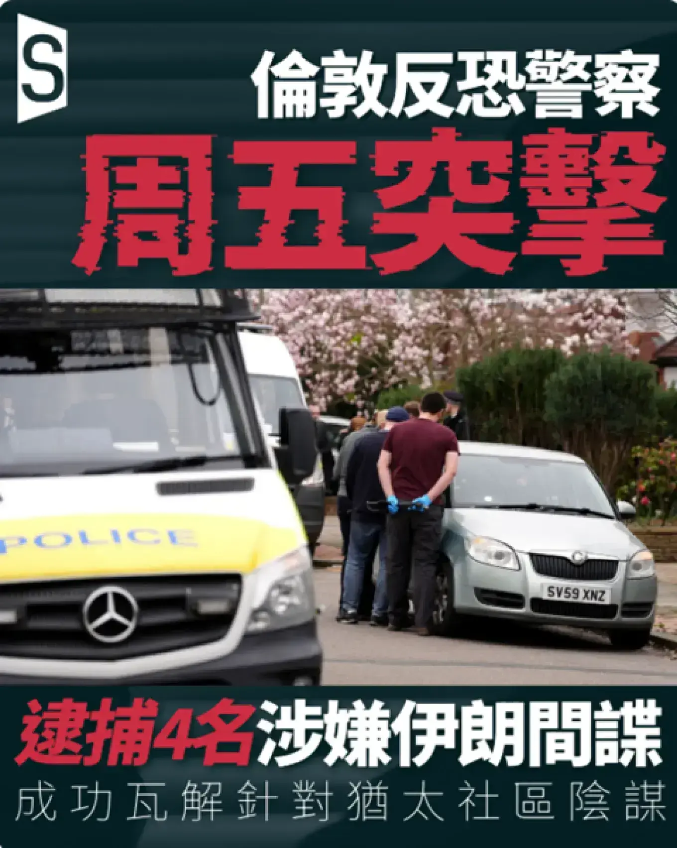 大都會警察局(Metropolitan Police)反恐部門周五凌晨在倫敦西北部多個地址採取行動,在哈羅(Harrow)、沃特福德(Watford)及巴內特(Barnet)逮捕四人。被捕者包括一名伊朗籍人士及三名英伊雙重國籍人士,當局以涉嫌違反2023年《國家安全法》中協助外國情報機構的罪名將四人拘押。警方同時在哈羅另一地址拘捕六名男子,涉嫌妨礙原有逮捕行動。警方表示,正搜查巴內特及溫布利(Wembley)兩處額外地址。