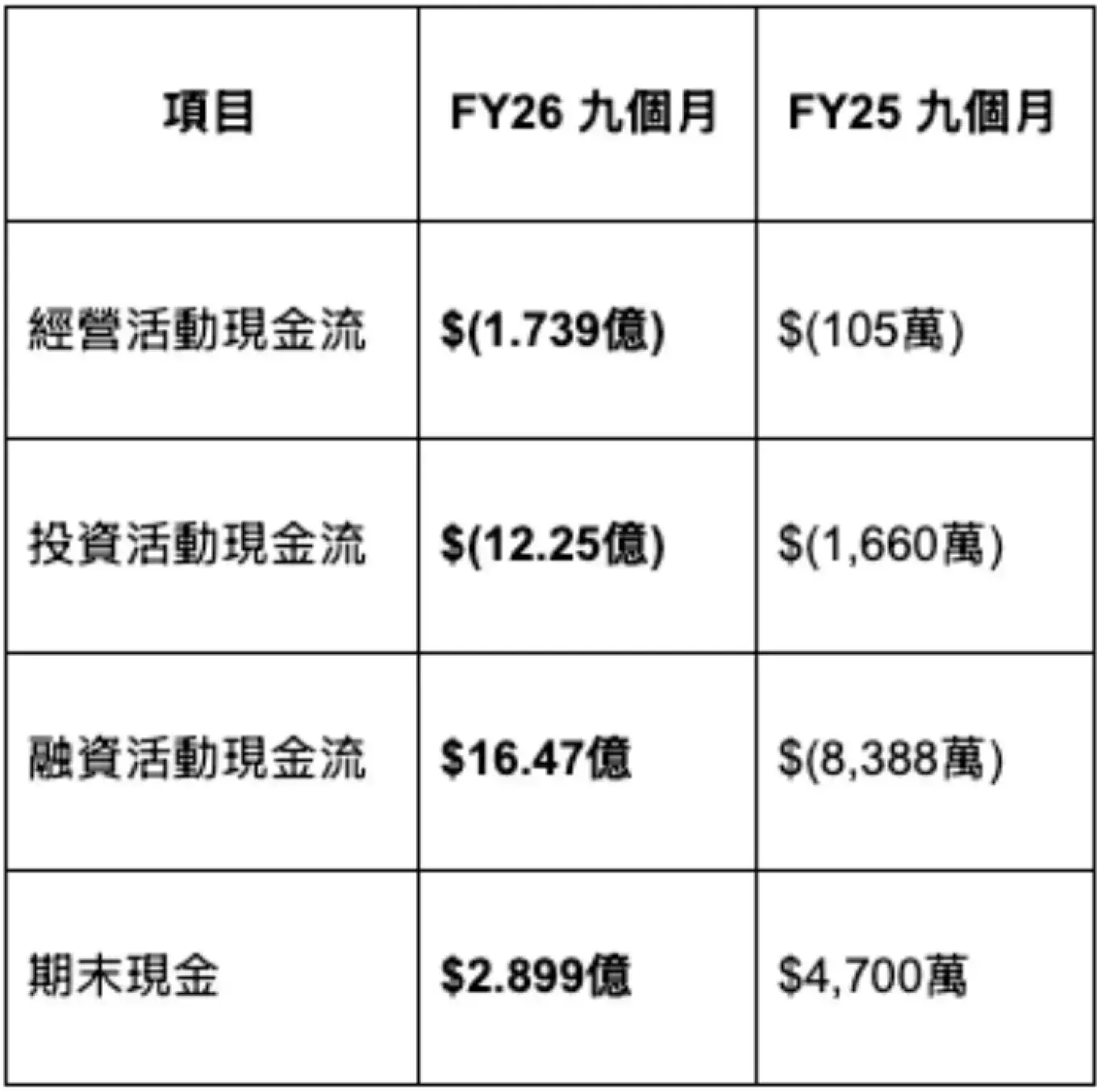 (四)營運現金流持續大幅流出。 九個月經營活動現金流出 $(1.739億),主要受未開票應收款增加$1.421億、