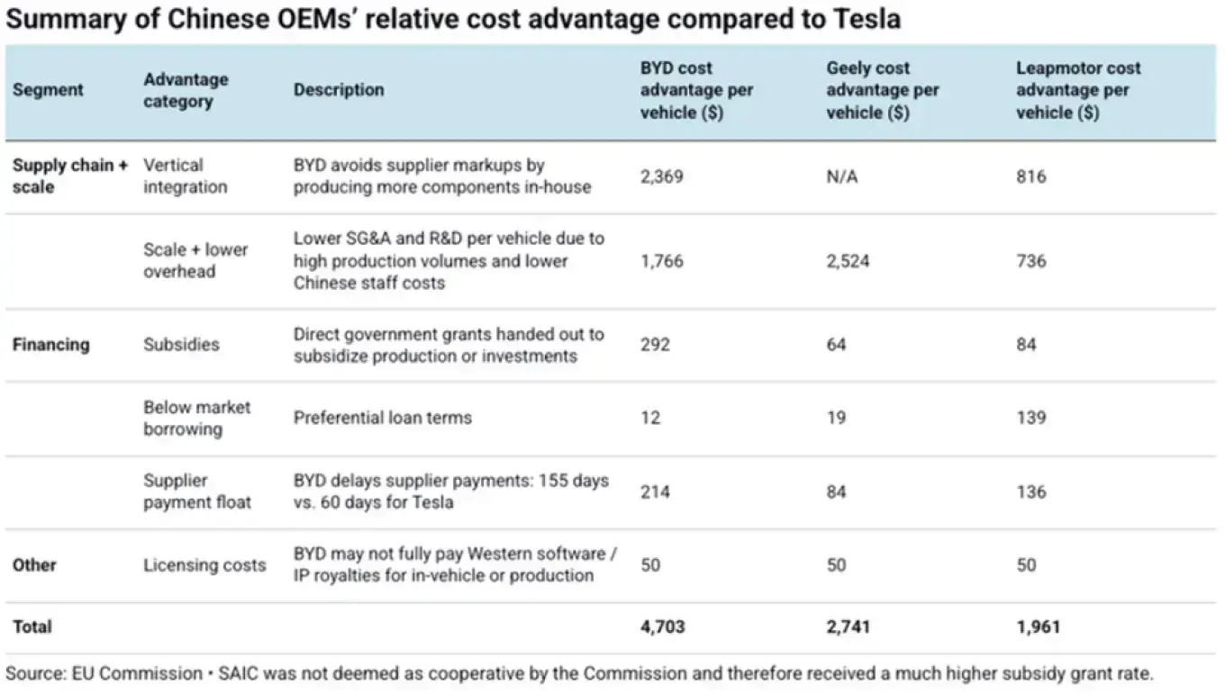 歐盟為此加徵了 17% 的反補貼關稅,加上標準 10% 合計 27%。但 $4,700 的差距中有 $4,400 來自企業層面的結構性成本優勢,不是政府的錢。關稅打的是補貼,