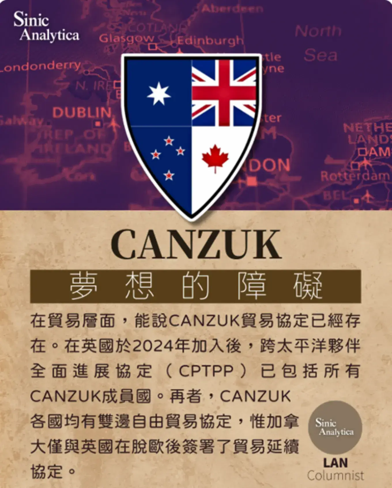 在貿易層面,能說CANZUK貿易協定已經存在。在英國於2024年加入後,跨太平洋夥伴全面進展協定(CPTPP)已包括所有CANZUK成員國。再者,CANZUK各國均有雙邊自由貿易協定,惟加拿大僅與英國在脫歐後簽署了貿易延續協定。然而,粗略檢視貿易數據卻顯示另一情況,CANZUK各國有限的工業能力以及其距離甚遠將會帶來極大的挑戰,正如前澳洲總理 陸克文(Kevin Rudd) 所言:「我們6500萬人口與英國旁邊4.5億歐洲人的市場相比,根本不值一提。」(Rudd, 2019)
