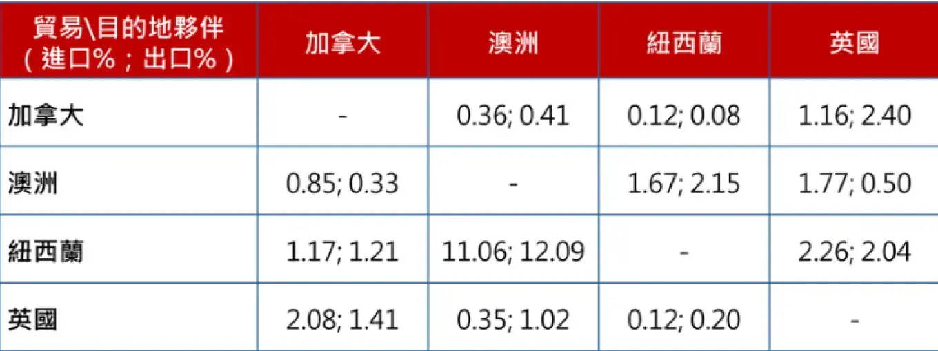 2022年CANZUK國家間貿易 (World Bank, 2025a;World Bank, 2025b;World Bank, 2025c;World Bank, 2025d)