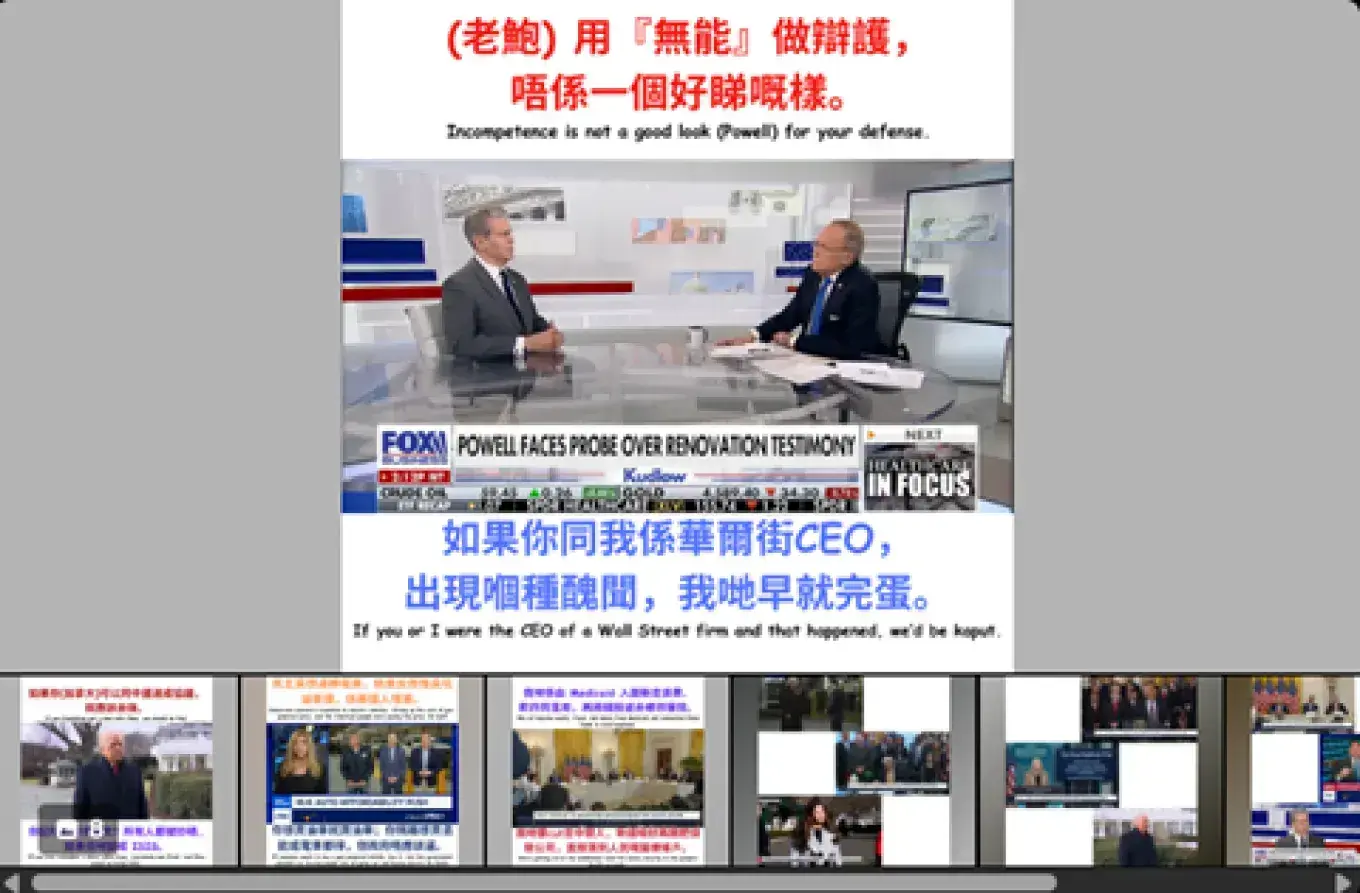 特朗普嚴厲抨擊聯儲局主席*鮑威爾*,指其利率政策「太遲、太高」,拖慢經濟。他亦批評聯儲局總部翻修工程花費「數以十億計」,直言自己「2500萬美元就能搞掂」,質疑鮑威爾不是腐敗、就是極度無能。